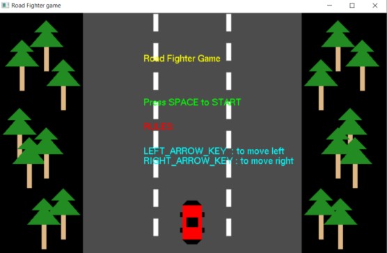 The game is a single-player type in the racing genre. The game loads with a start screen. The start screen mentions the controls used to play the game. To start the game, the user would have to press the spacebar key. When the game starts we see a forest scene wherein there is a road with lots of cars. There is a player (main car) that has to race forward while saving itself from colliding with other vehicles which act as obstacles. These vehicles(obstacles) move in the opposite direction to that of the main car (player). To save itself from colliding the player car can move in the left and right direction. The game has 2 levels. The first level has a forest scene. When the score becomes higher than 500 points, level 2 automatically starts. In level 2, the view changes to the city scene, and the obstacle cars change to more powerful racer cars. The lives and the real-time score are continuously displayed on the screen. The player car has 3 lives i.e. it can collide a maximum of 3 times with the obstacle cars, after which the game would end. When the game gets over, the score for the current game along with the highest score of all the consecutive games is displayed on the screen. The user can replay the game by pressing the spacebar key..